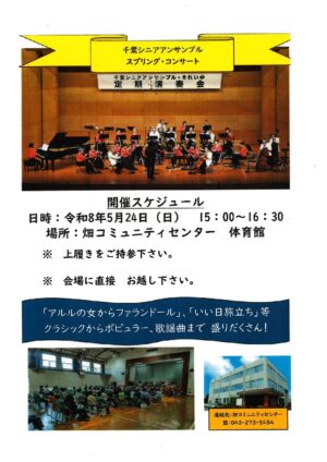 - 千葉シニアアンサンブル スプリング・コンサート日時:5月24日(日) 15:00~16:30 場所:畑コミュニティセンター 体育館※上履きをご持参下さい。 ※会場に直接お越し下さい。