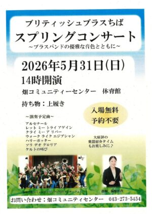 - ブリティッシュブラスちば スプリングコンサート ~ブラスバンドの優雅な音色とともに~日時:5月31日(日)14時開演 場所:畑コミュニティセンター 体育館 入場無料・予約不要 持ち物:上履き