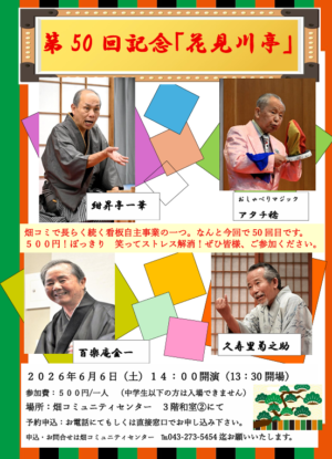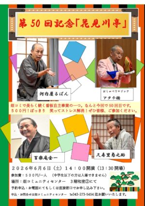 畑コミュニティセンターで長らく続く看板自主事業の一つでなんと今回で記念すべき50回目です。多くの皆様のご来場を心よりお待ちしております。