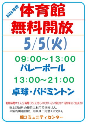 - 5月9日(土)体育館のご利用について5月9日 (土) 9:00~21:00 車いすラグビー練習会のため 体育館は利用できません ご迷惑をお掛けしますが、ご理解・ご協力のほど、 よろしくお願いいたします。畑コミュニティセンター