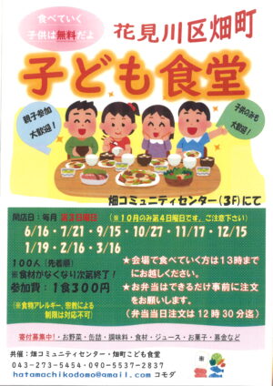 【予約受付中】子ども食堂 (基本毎月第3日曜日開催予定) 2025年11月7日 最終更新日時 : 2025年11月9日 畑コミュニティセンター 開催中 畑コミュニティセンターで【子ども食堂】を実施しています!!!!! 畑コミュニティセンター 食べて行く子どもは無料 大人や弁当は 1食:500円 詳細は 043-273-5454 畑コミュニティセンターまでお問い合わせ下さい。 ご予約はお早めにお願い致します。 是非ご利用下さい。 写真は 実施時の映像です。